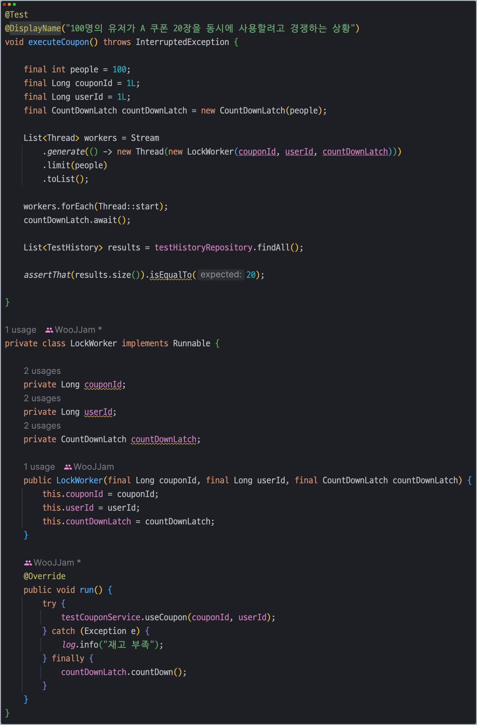 나는 단순히 쿠폰의 재고가 정확히 소진되었는지만 검증하고 싶기 때문에 단순하게 반복문으로 뚜깍뚜깍 작성해보았다.