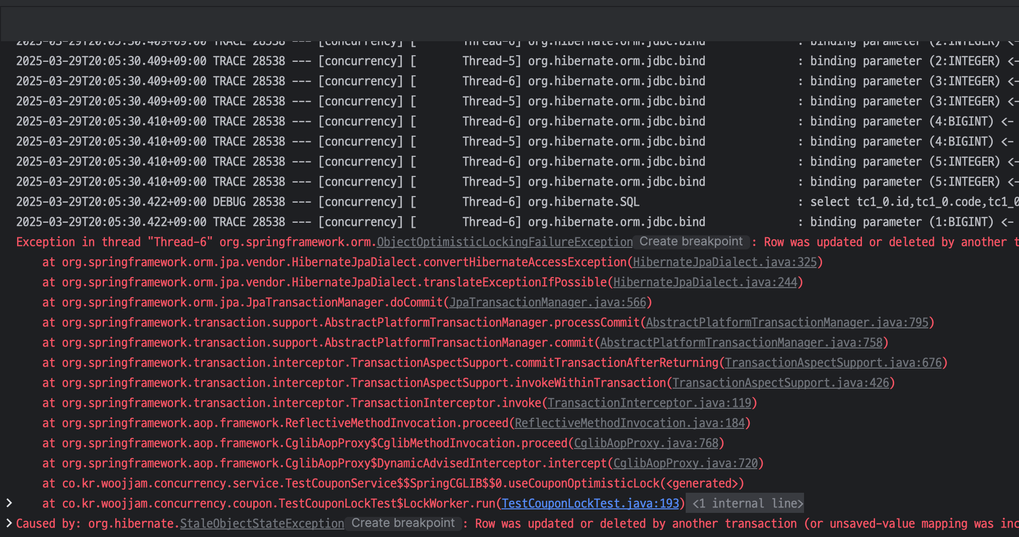 사실 동시성이 발생하는 이유가 TestCoupon을 조회한 뒤 재고를 감소시키는 동안, 다른 트랜잭션이 해당 데이터를 동시에 조회 및 수정하게 되면서 동시성 충돌이 발생한것이다.