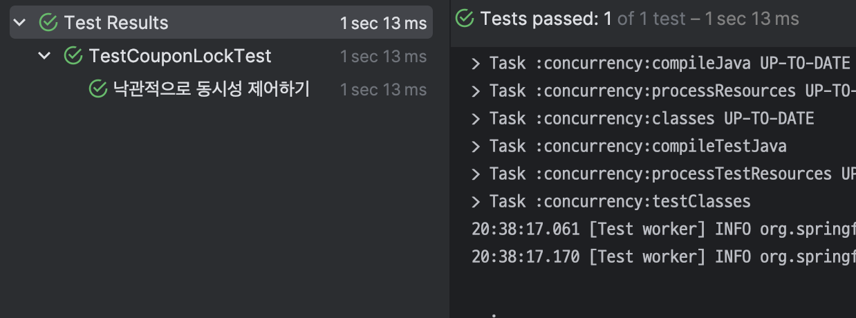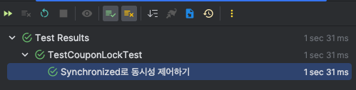 분명 처음에는 synchronzied로는 동시성을 제어하기 어렵다고 했는데, 너무나도 쉽게 테스트가 성공했다.