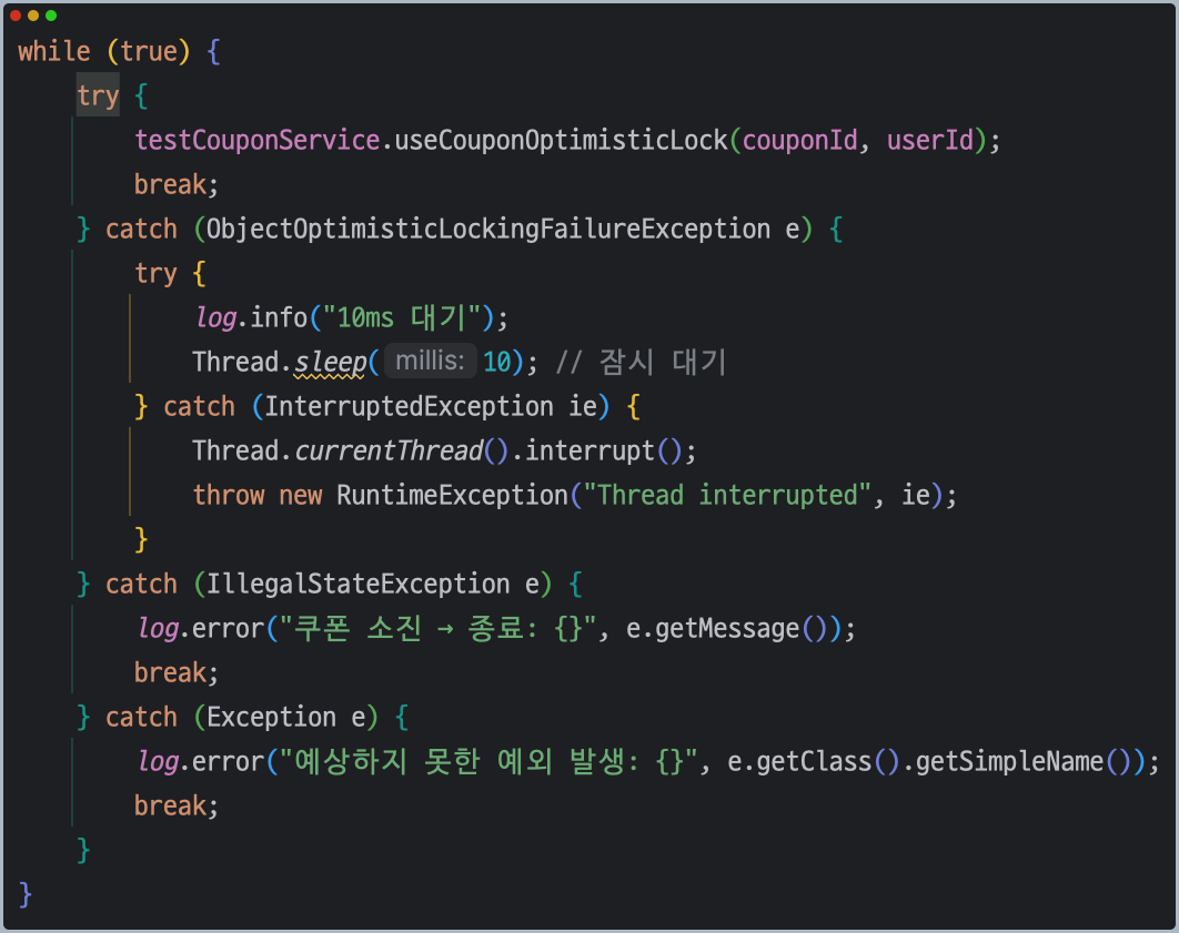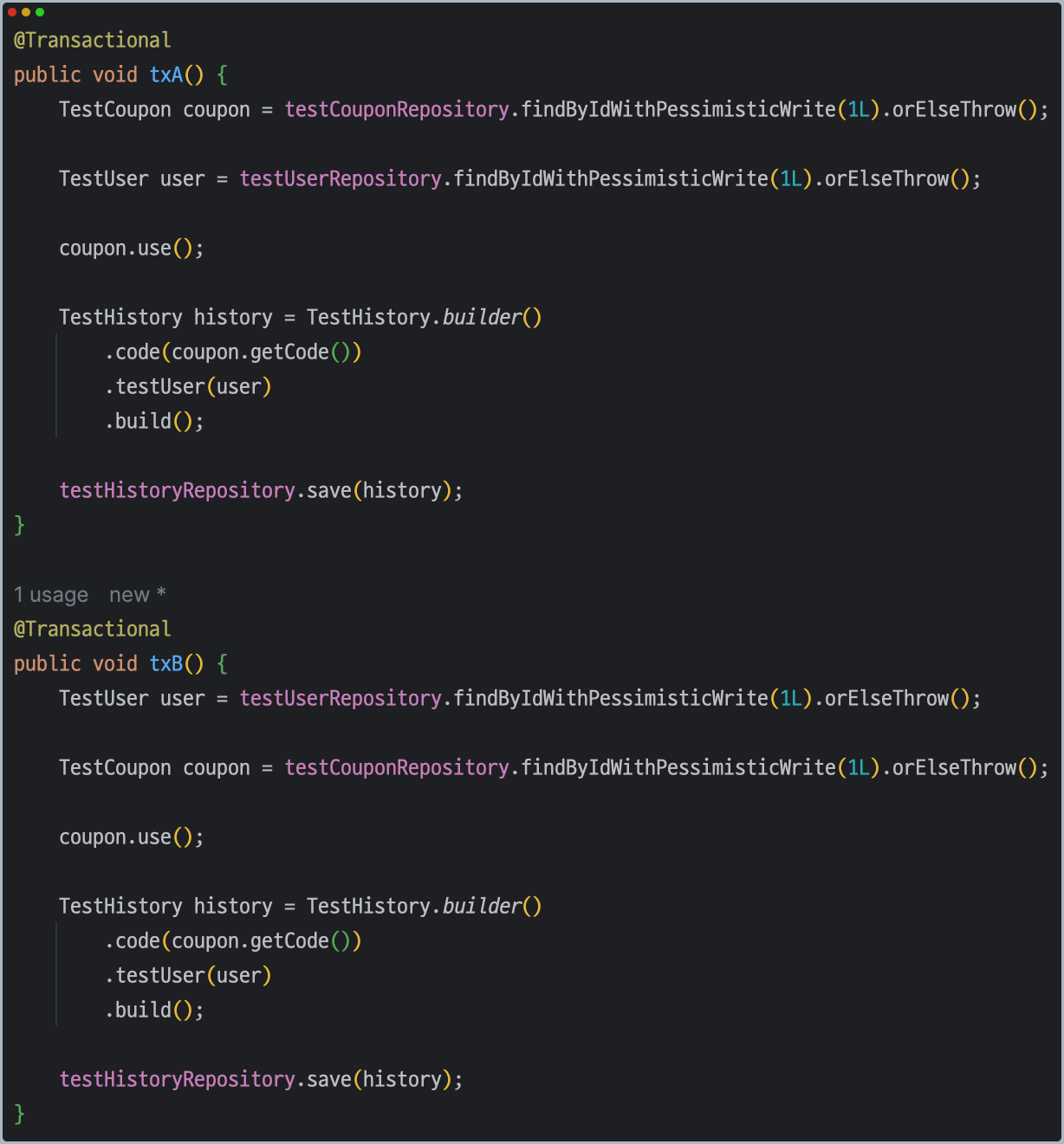해당 코드는 Coupon과 User 객체를 조회한 뒤, 해당 쿠폰의 재고가 남아있다면 쿠폰을 사용하고, 재고가 없다면 예외를 발생시킨다. 그리고 쿠폰을 사용 했다면 User가 Coupon을 사용한 이력을 History에 저장하는 비즈니스 로직이다.
