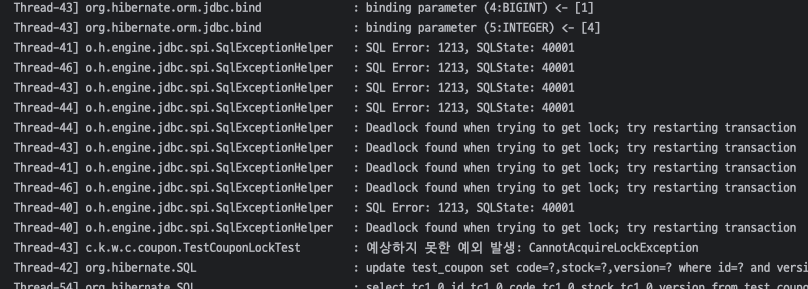 이렇게 1번, 2번 트랜잭션이 서로를 기다리며 영원히 대기하는데드락이 발생하게 된다. MySQL의 데드락 감지 알고리즘에 의해 특정 트랜잭션이 강제로 롤백되게 되고, 이로 인해 일부 유저의 쿠폰 사용 요청이 실패하면서 정확히 20개의 쿠폰이 정상적으로 사용되지 않았다.