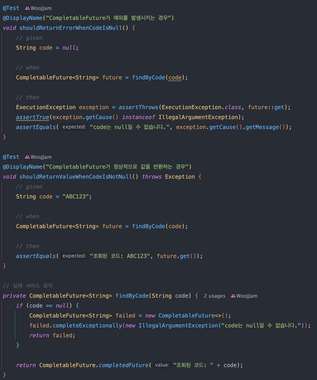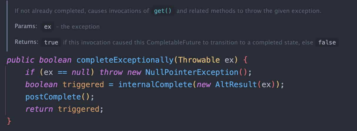 반면 `completeExceptionally()` 은 말 그대로 "이 작업은 실패했어!" 라고 `Future`에게 알려주는 메서드이다. 예를 들자면 인자로 전달된 값이 null이거나, 타임 아웃 등 외부 조건에서 예외가 발생하는 경우 강제로 실패해야할 경우 해당 메소드를 통해서 예외를 발생시키는 것이다.