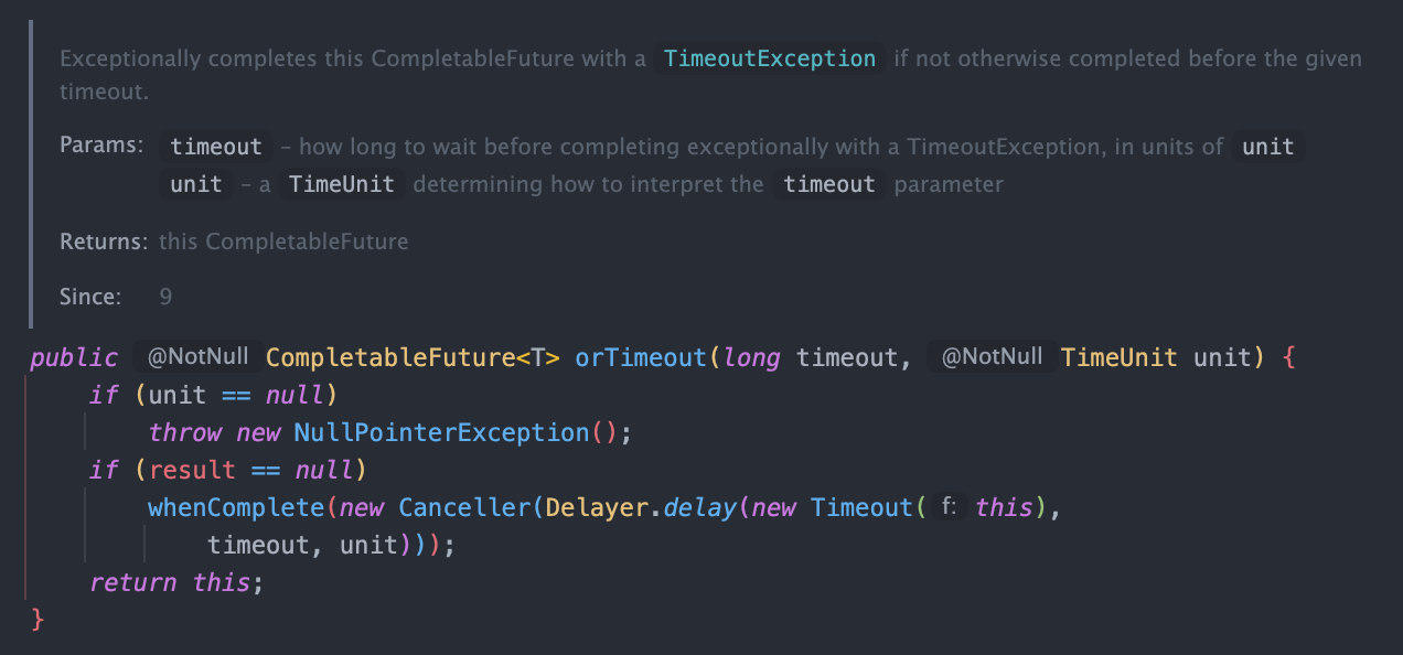 orTimeout() 은 비동기 작업 체이닝 도중 시간이 초과되면 자동으로 `TimeoutException`이 발생한다. `get()` 과 달리 체이닝이 가능하며, 논블로킹으로 동작한다.