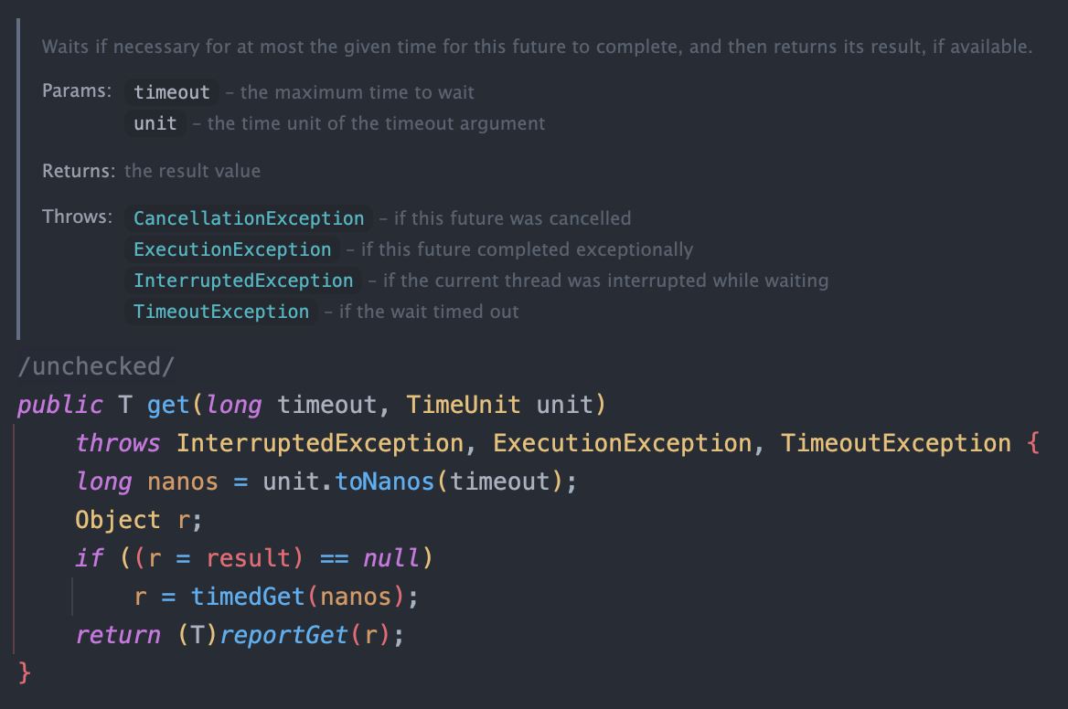get() 메서드를 통해 timeout 설정이 가능한데 이는 java8에서 부터 가능했던 전통적인 방식이다. `Future` 처럼 결과를 지정된 시간 내에 기다리다가 시간이 초과되면 예외가 발생한다.