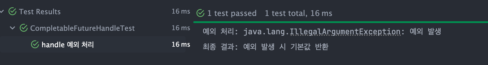 궁극적으로 2가지 메소드의 차이는 역할이다. `handle` 은 예외를 처리해주고, `completeExceptionally` 는 예외를 발생시키는 쪽이다.