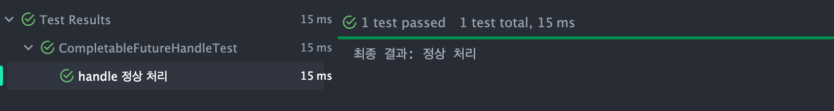 handle() 메서드는 비동기 작업이 성공하든 실패하든 무조건 호출된다. 즉, 결과와 예외를 동시에 받아 처리할 수 있는 매우 유연한 처리방식이다.