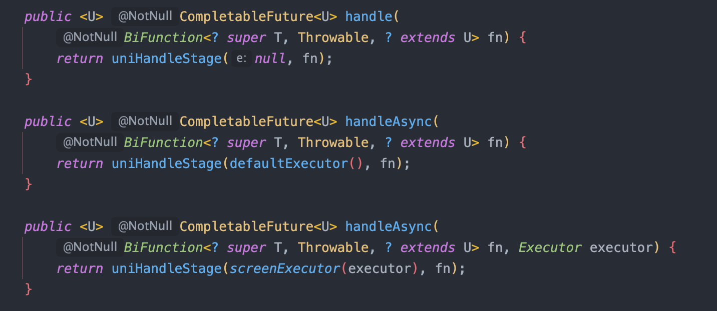 `handle` 메소드는 2개의 파라미터를 가진다. `(result, ex) -> { ... }` 형식의 `BiFunction` 이다.