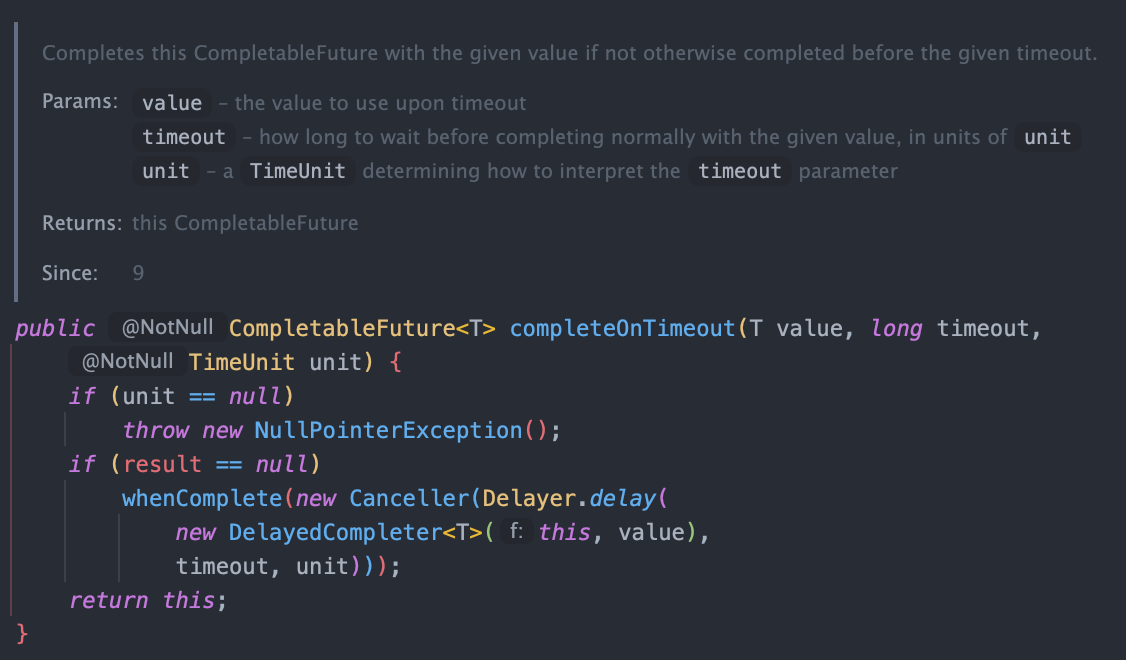 java9 부터는 timeout을 위한 `orTimeout()`, `completeOnTimeout()` 메서드가 추가되었다.