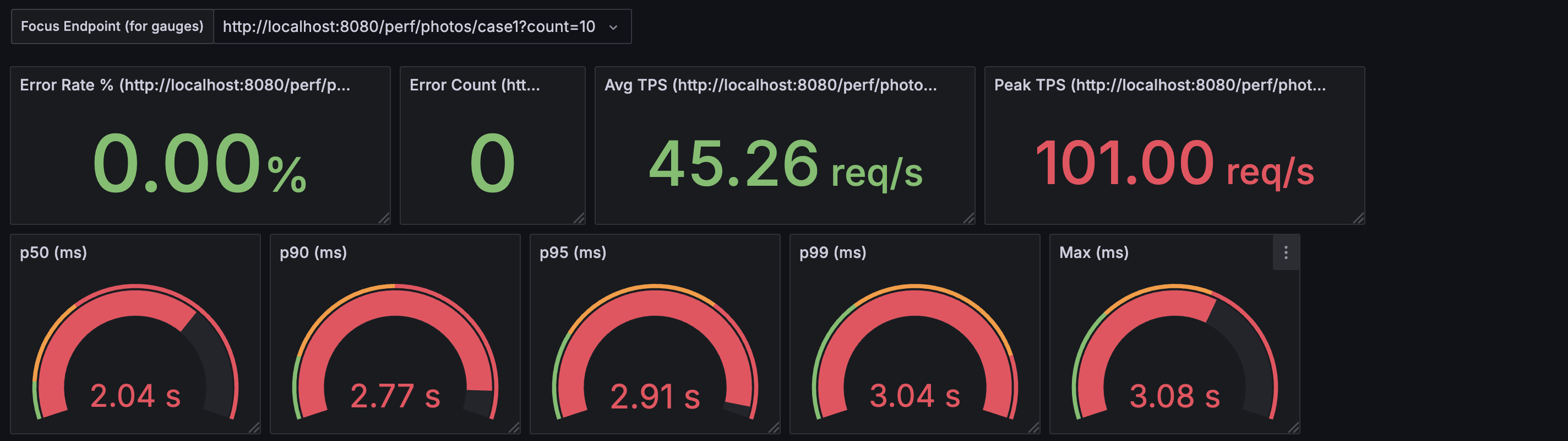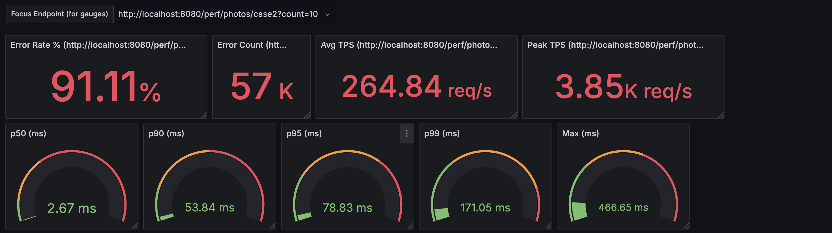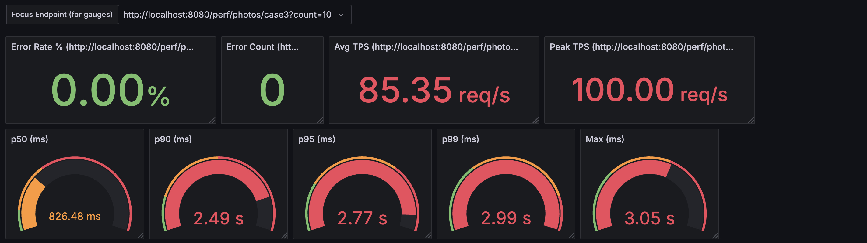 백그라운드에서 스레드 풀이 포화 상태임에도 불구하고, 응답 지표 자체는 괜찮아 보인다. 하지만 만약 이 상태에서 트래픽이 더욱 몰리게 되면 스레드 풀에서 처리할 수 없는 작업은 많아지고, 결국 CallerRunsPolicy의 동작 횟수는 증가하게 되어 지연시간이 급격히 나빠질 수밖에 없다.