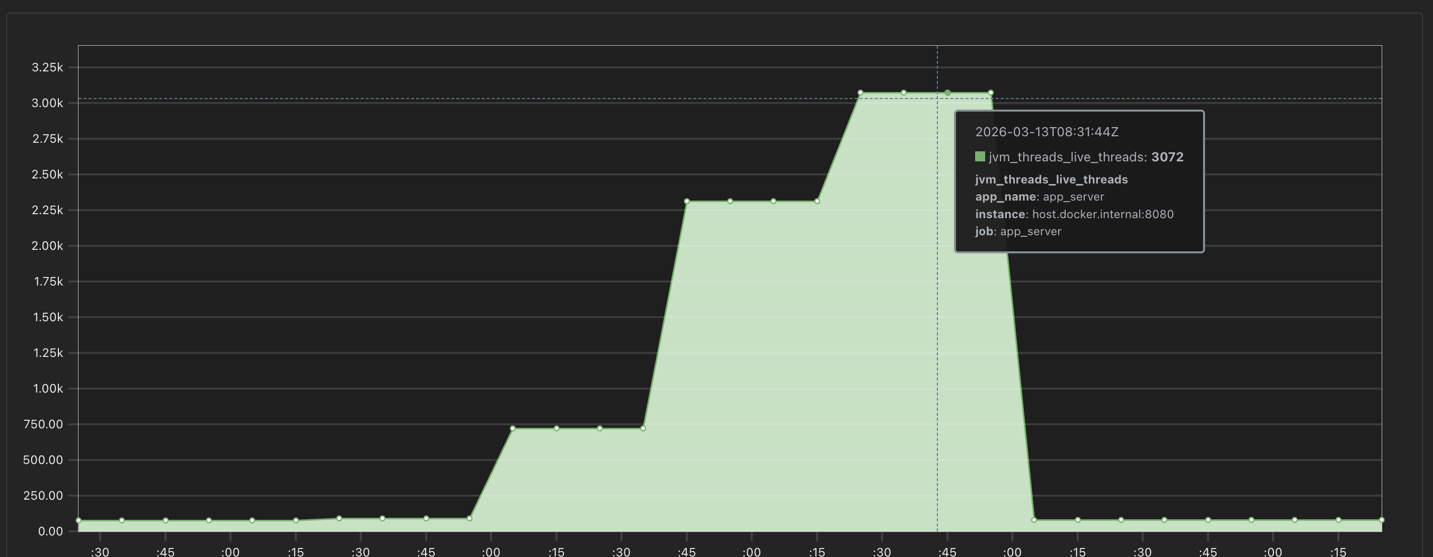 프로메테우스로 실제 활성화된 스레드의 수를 확인해 보았다. 놀랍게도 작업이 가장 많을 때 OS 스레드가 3000개 이상으로 증가한 것을 확인할 수 있다.