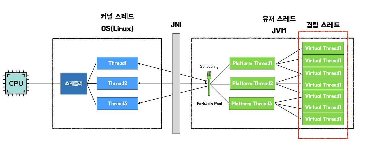 Virtual Thread는 기존의 OS Thread 단위로의 생성이 아닌 JVM 내부에서 Virtual Thread를 생성하고, 미리 생성된 Carrier Thread로의 스케쥴링을 통해 기존 아키텍처에 비해 리소스 비용을 크게 절감하였다.