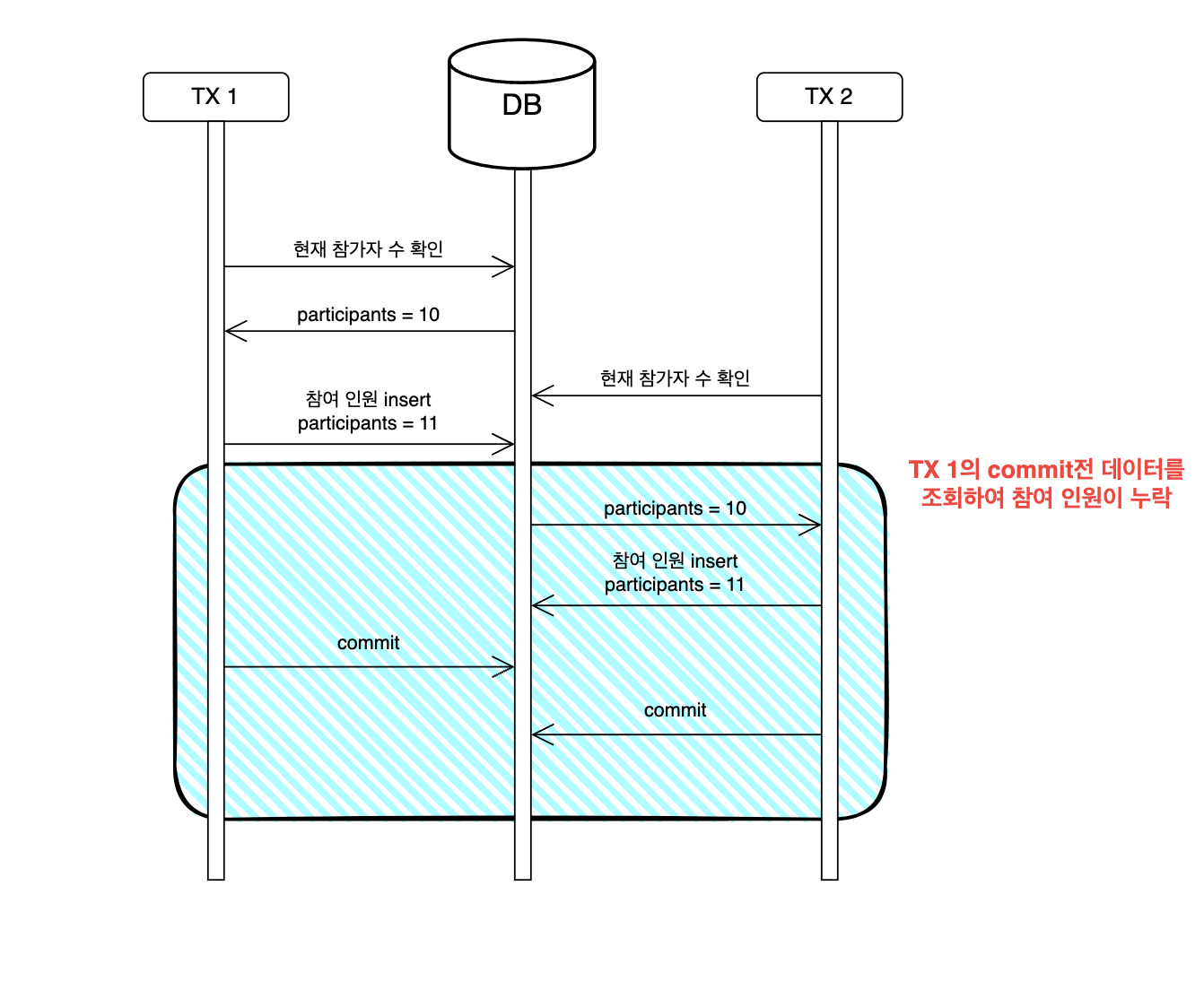 문제는 참여 인원을 확인하고, 새로운 참가자를 등록할 때 발생한다. TX 1에서 현재 참가자 수를 확인하고, 새로운 참가자를 insert 한 뒤에 commit을 진행한다. 이때 TX 2가 TX 1의 commit되기 전 데이터를 조회하여 새로운 참가자를 추가하기에 실제로 매치에 참여한 인원은 12명이 되어야 하지만 데이터베이스에는 11명으로 저장되는 문제가 발생할 수 있다.