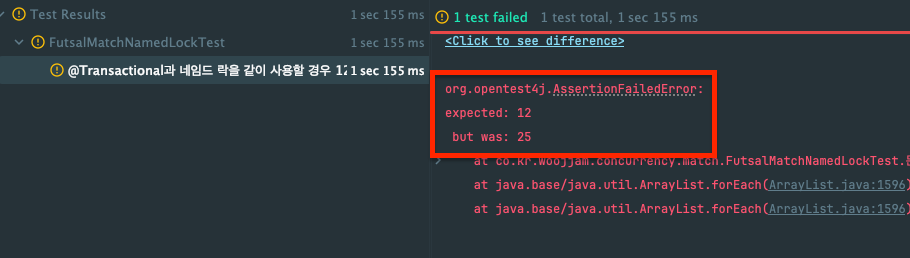 테스트 결과를 살펴보면 기대한 매치 참여 인원은 12명임에도 불구하고 총 25명이 매치에 신청된걸 확인할 수 있다. 따라서 GET_LOCK을 `@Transactional` 바깥에서 실행하거나 락을 점유한 뒤 메인 비즈니스 로직에 `@Transactional(propagation = Propagation.REQUIRES_NEW)` 을 추가하여 별도의 새 트랜잭션에서 실행되도록 제어해주어야 한다.