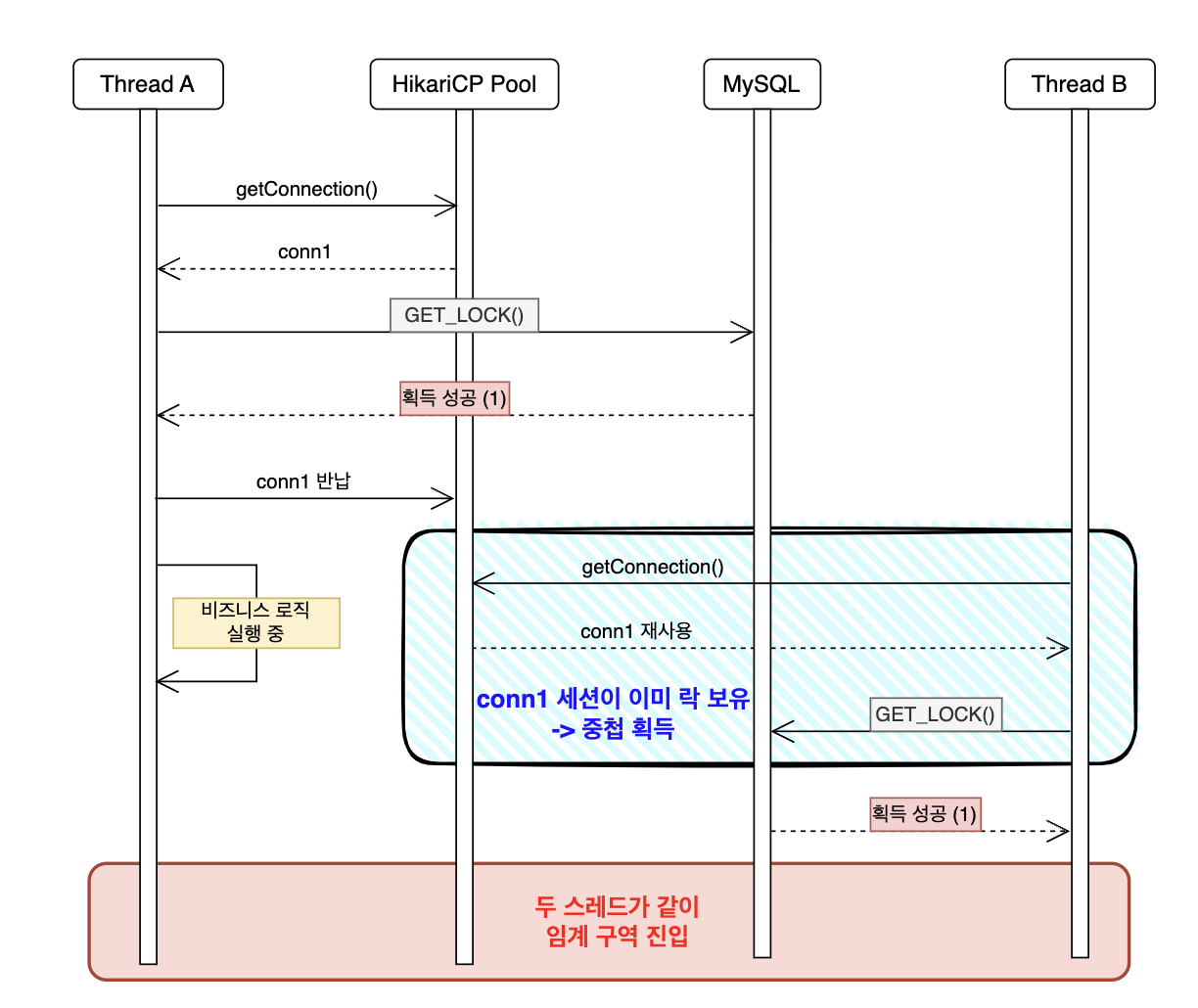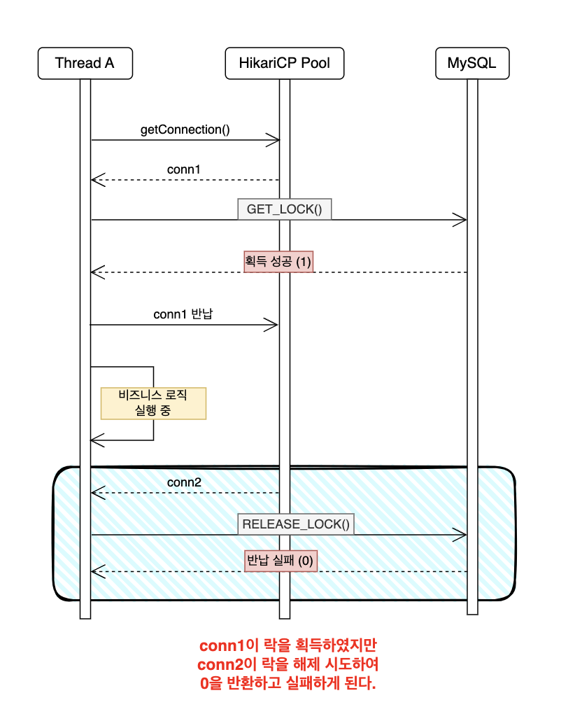 // GET_LOCK: conn1 사용 후 즉시 풀에 반납 (lock은 conn1 세션에 귀속)