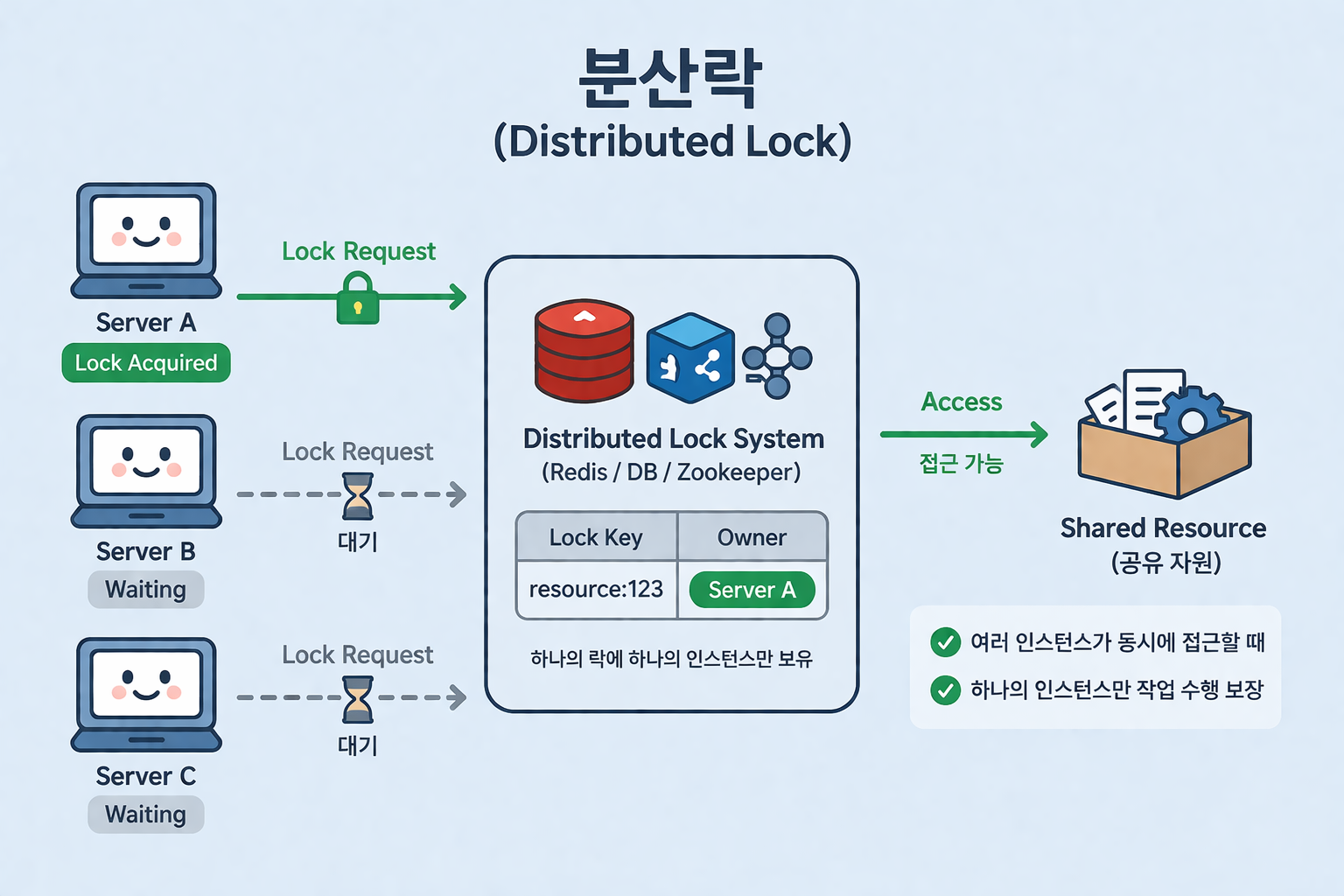 - 인스턴스 전체가 같은 MySQL을 사용하므로 같은 락 이름을 공유한다. 따라서 락 이름 설정시 규칙을 반드시 정의해야 한다.
